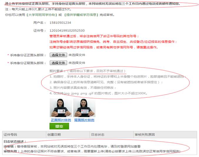 上传完毕后等待客服审核,审核通过后您才可以进入实名信息绑定步骤。客服审核由学信网进行人工处理,为了能及时准确的解决您注册过程中遇到的问题,请按要求上传有效的身份证照片。你也可以点击左侧的菜单“证件重复-客服审核”来关注客服的审核进度。